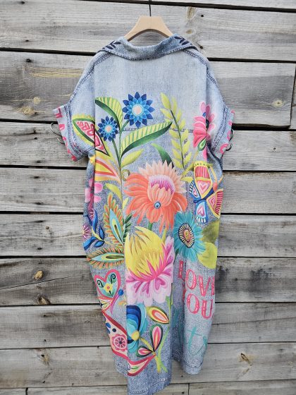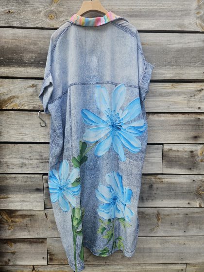 Son tissu très fluide imitation jean lui donne un look décontracté, sublimé par de jolies fleurs (rose ou bleu) pour une touche féminine 🌺