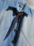 Confectionnée dans une toile denim très fluide, elle offre un tombé léger et agréable à porter. Elle se distingue par sa petite cravate intégrée autour du cou, ornée de motifs à pois marron et bleu, sublimée par de délicates perles pour une touche d’originalité.