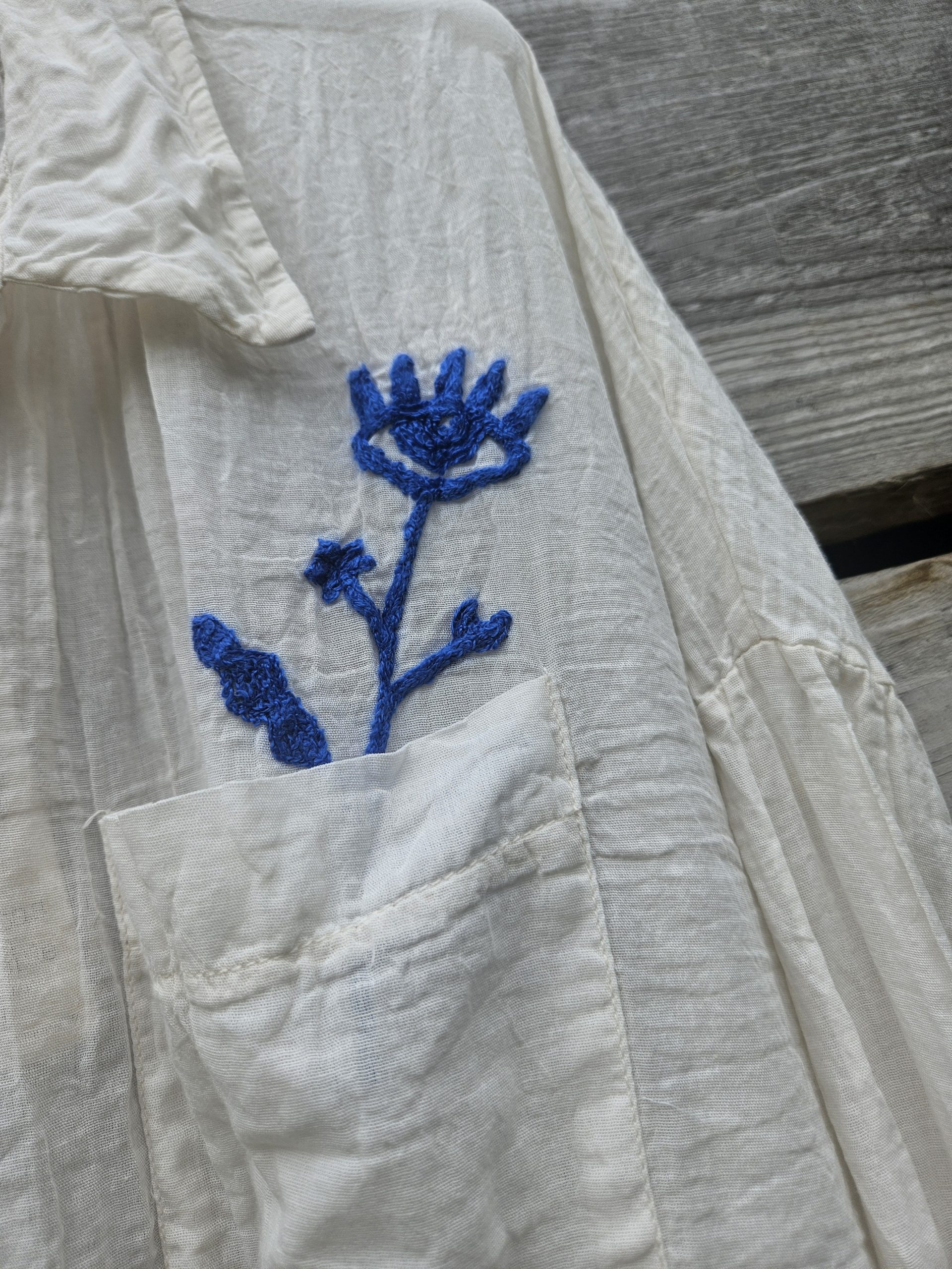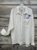 Confectionnée en 100% coton à l’aspect légèrement froissé, elle séduit par son confort et son tombé fluide, idéal au quotidien. Son détail signature ? Une poche poitrine sublimée par une broderie originale laissant éclore une fleur accompagnée d’un œil, symbole à la fois mystérieux et artistique.