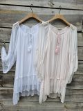 Sa coupe ample, sublimée par de légers pans sur les côtés, apporte du mouvement et une allure décontractée chic. Le détail des cordelettes sur le devant ajoute une touche authentique et délicatement féminine, parfaite pour accentuer son esprit bohème.