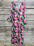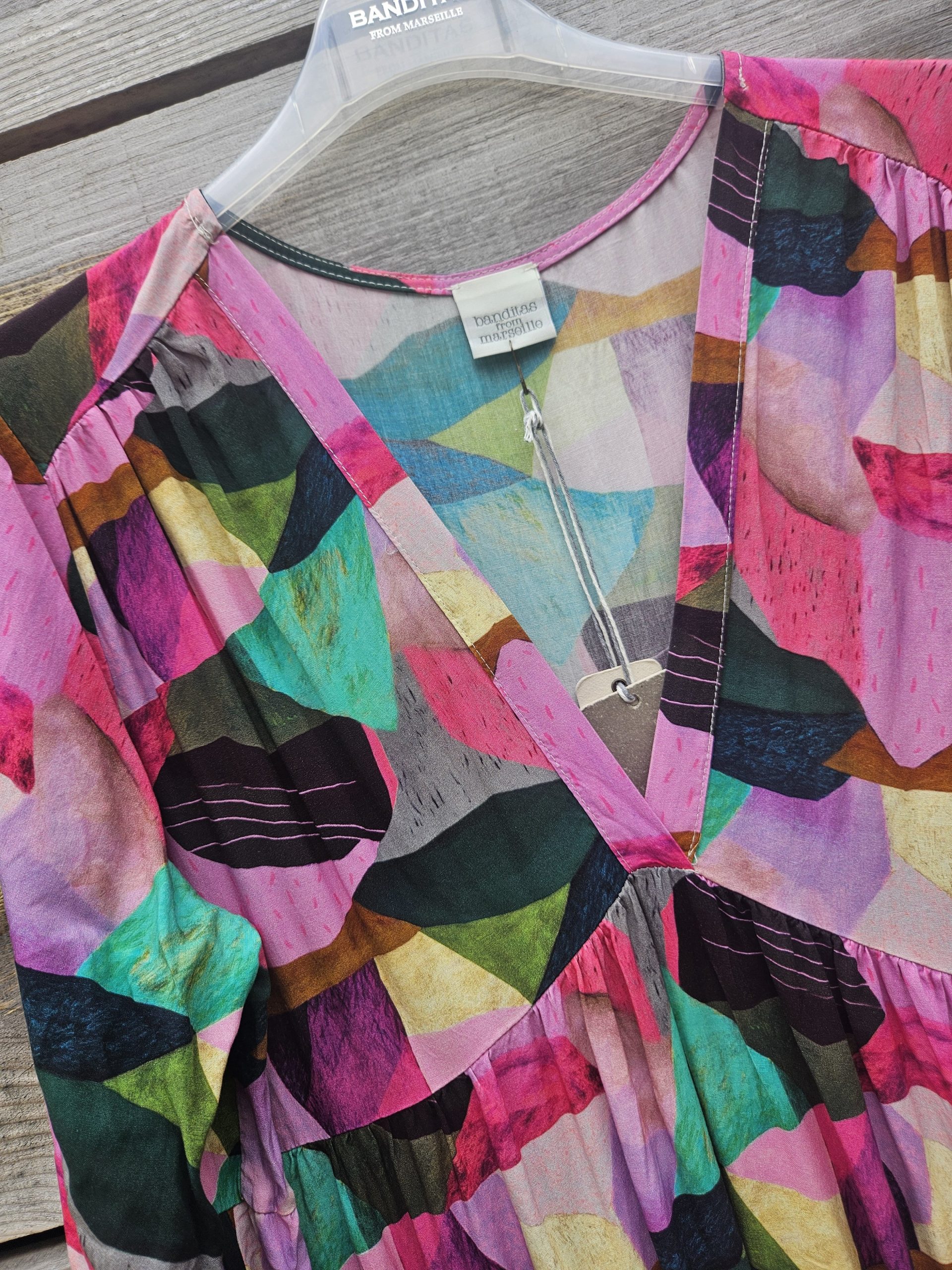 Son imprimé façon collage, riche en couleurs, apporte une touche artistique et vibrante à votre tenue. L’encolure en V sublime le décolleté avec subtilité, pour une silhouette féminine et naturelle.